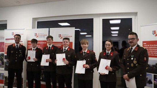 Besonders erfreulich ist, dass sich aktuell 24 Jugendfeuerwehrmitglieder in der Jugendgruppe auf den Einsatzdienst vorbereiten. Ihnen durften wir die begehrten Wissenstestleistungsabzeichen (16) sowie die Erprobungsstreifen übergeben.
