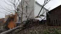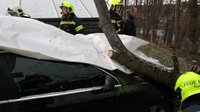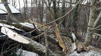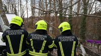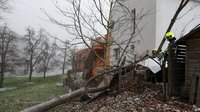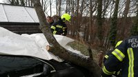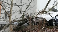 Durch den starken Wind war eine Esche auf einen parkenden Pkw gestürzt und hatte auch das angrenzende Haus beschädigt.