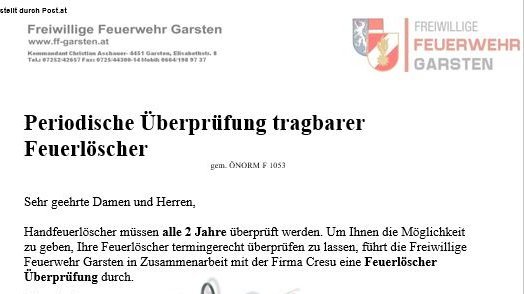 Die Freiwillige Feuerwehr Garsten führt am Samstag den 12. September von 08:00 bis 12:00 Uhr, in Zusammenarbeit mit einer Fachfirma eine Feuerlöscher Überprüfung durch.