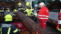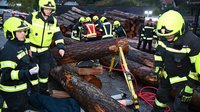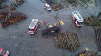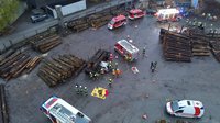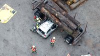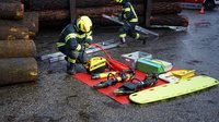 Person unter Holzstämmen eingeklemmt