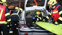 Verkehrsunfall mit eingeklemmter Person, Fahrzeug in Seitenlage