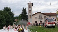 Zum Abschluss wurde, passend zu den hochsommerlichen Temperaturen, ein Schaumteppich auf der Wiese neben dem Feuerwehrhaus aufgebracht, in dem sich die Besucher ein wenig abkühlen konnten und den Nachmittag mit einer gehörigen Portion Spaß ausklingen ließen.