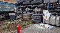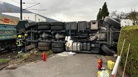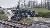 Das Heck des LKW`s wurde von dem Güterzug erfasst, infolge des heftigen Anpralles stürzte der LKW auf die Seite um.