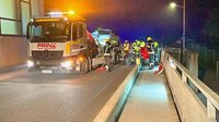 Der beschädigte Pkw musste vom Abschleppdienst mit einem Kran geborgen und das ausgetretene Öl von der Feuerwehr gebunden werden.