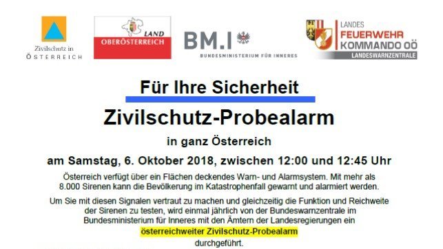 Am Samstag, 6. Oktober 2018, findet österreichweit in der Zeit zwischen 12:00 und 12:45 Uhr der jährliche Zivilschutz-Probealarm statt.