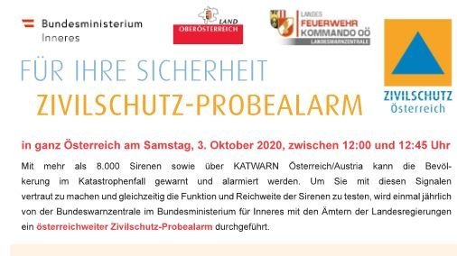 Am Samstag, 3. Oktober 2020, findet österreichweit in der Zeit zwischen 12:00 und 12:45 Uhr der jährliche Zivilschutz-Probealarm statt.